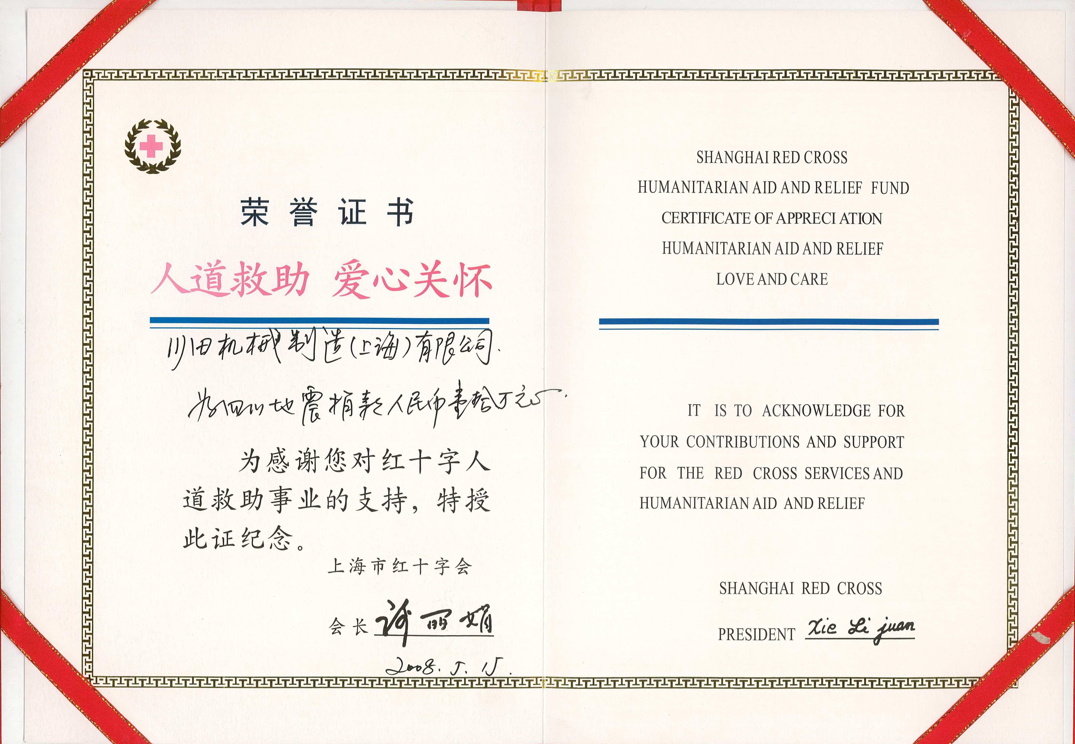 2008年度上海市赤十字栄譽証書-川田機械