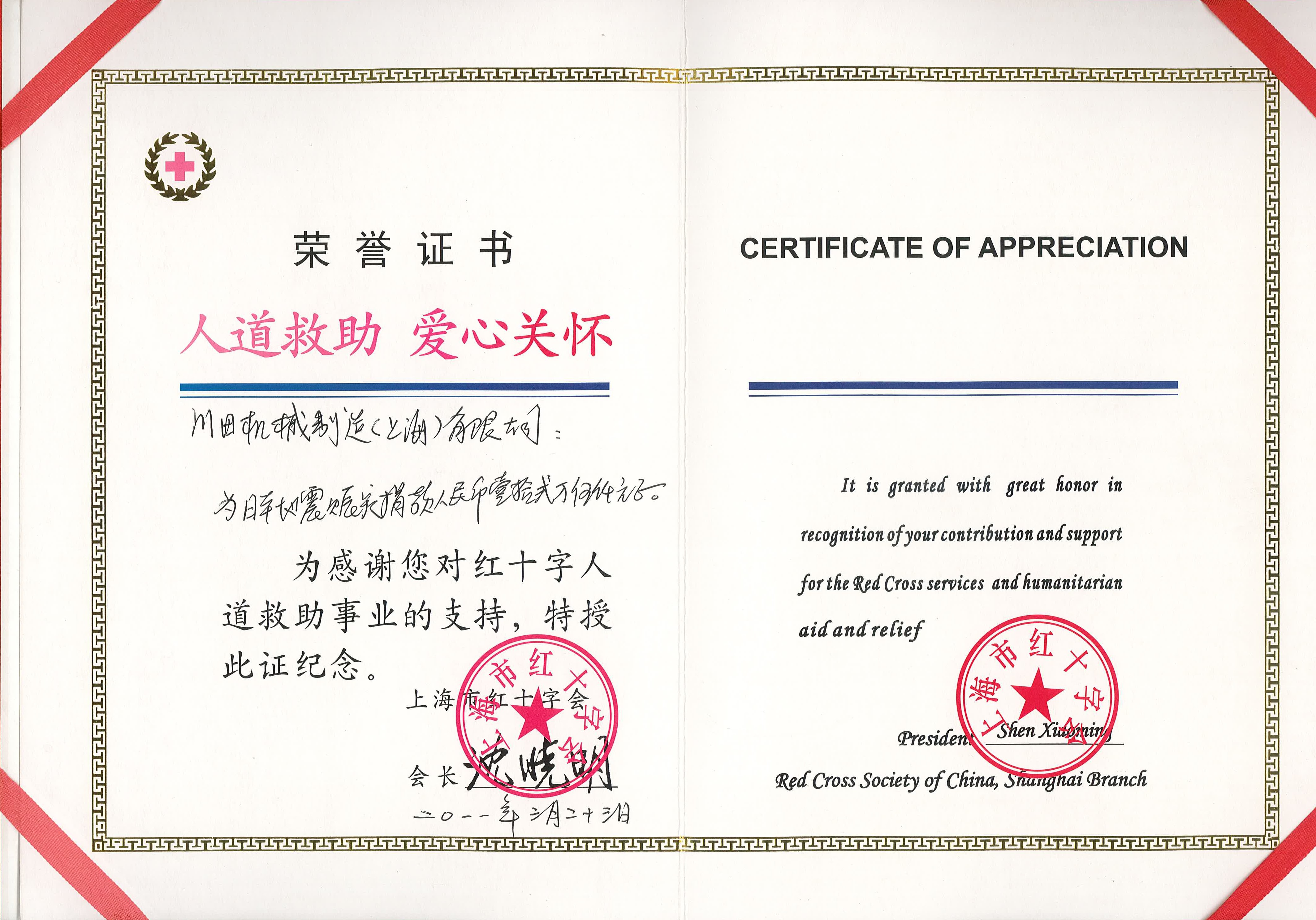 2011年度上海市赤十字栄譽証書